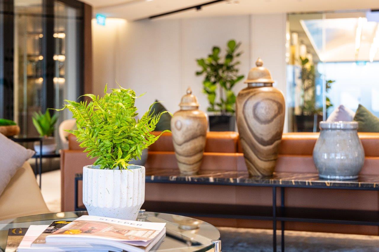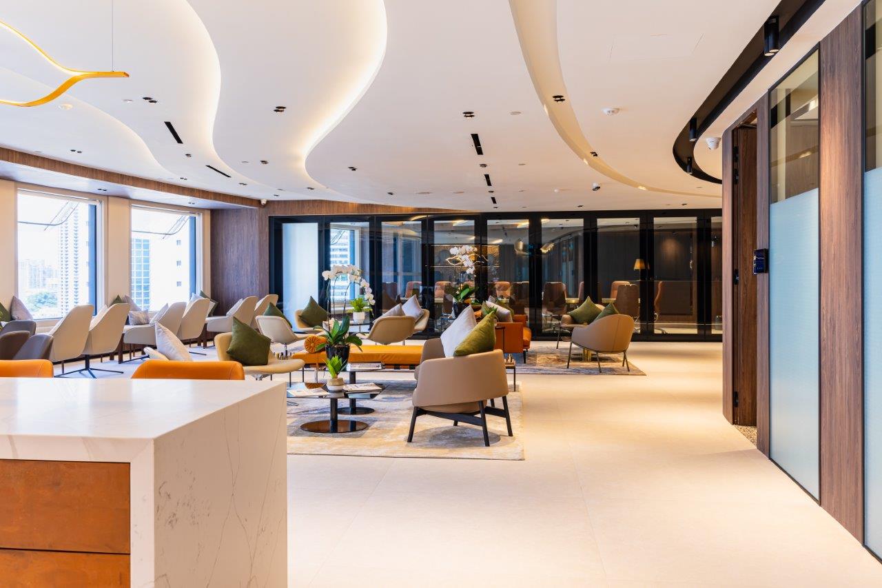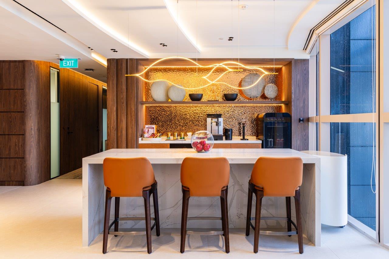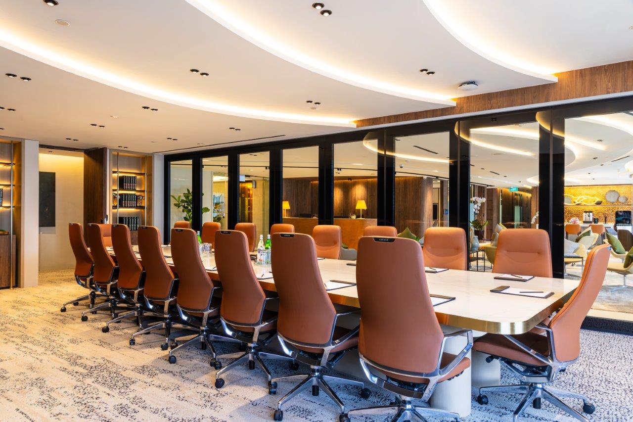 Designed with feng-shui principles, the business center features panoramic views of Marina Bay from its elegantly designed reception, lounge, and boardroom. The beige-toned common lounge, filled with natural light, enhances a serene and corporate atmosphere suitable for companies valuing discretion and professionalism.