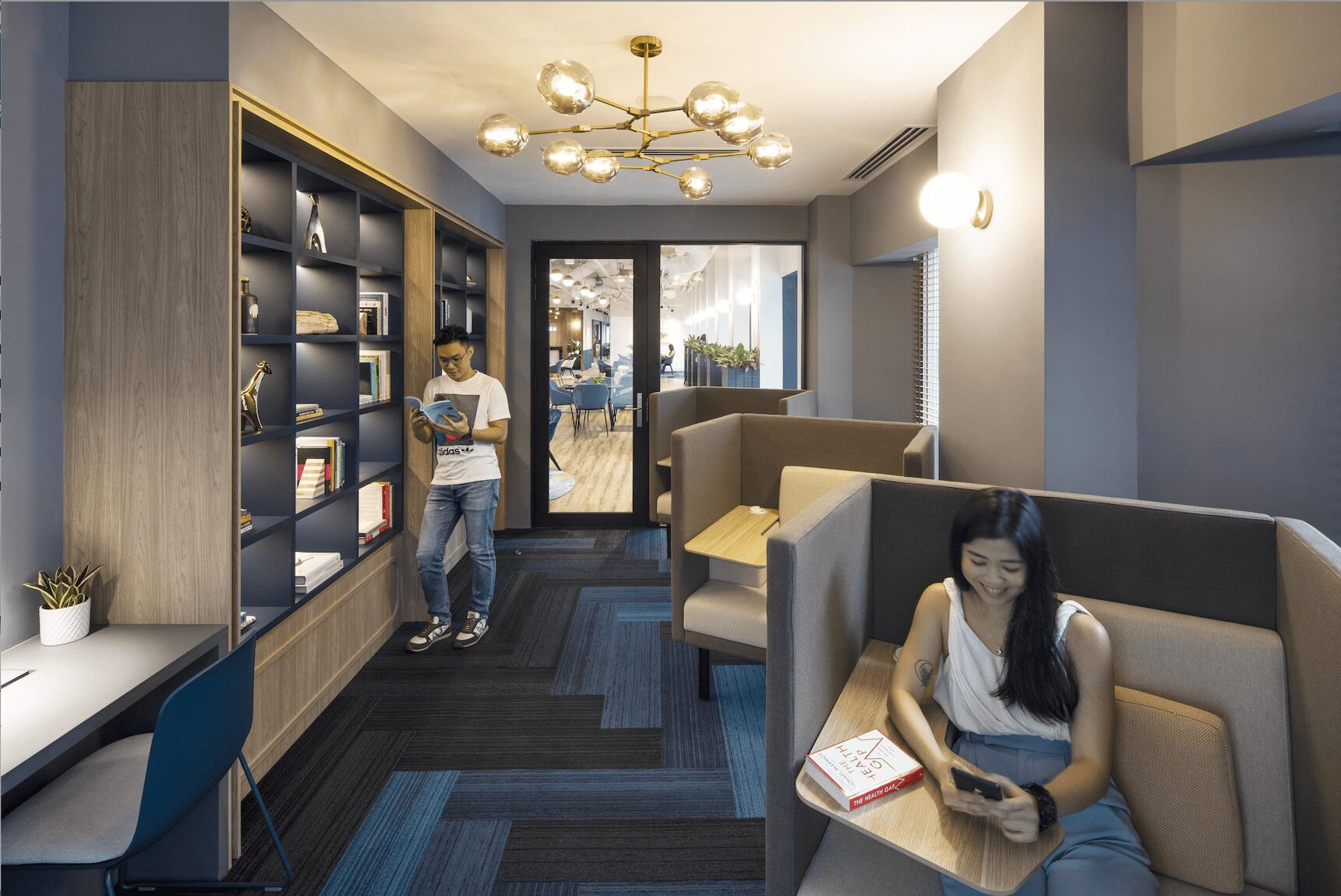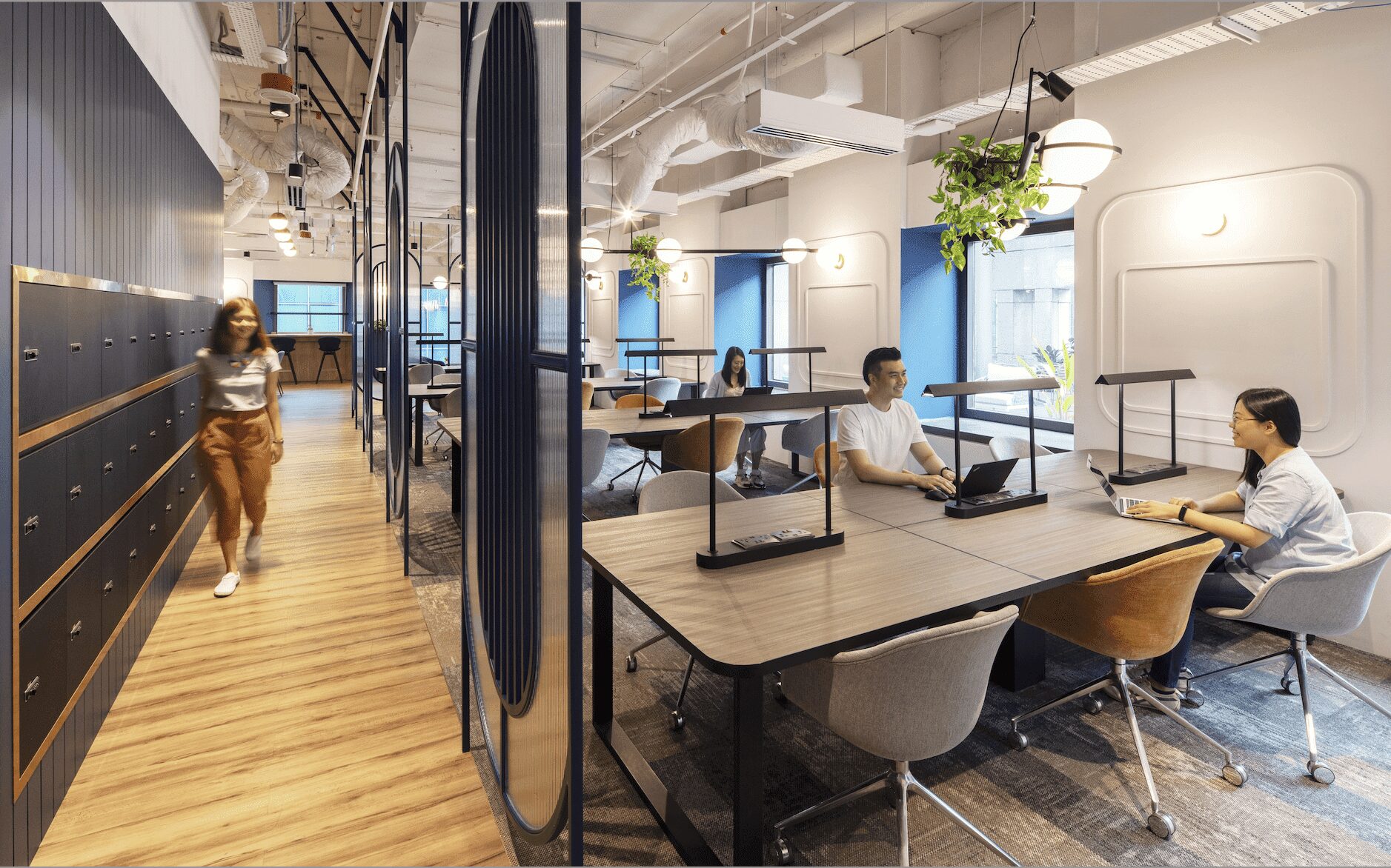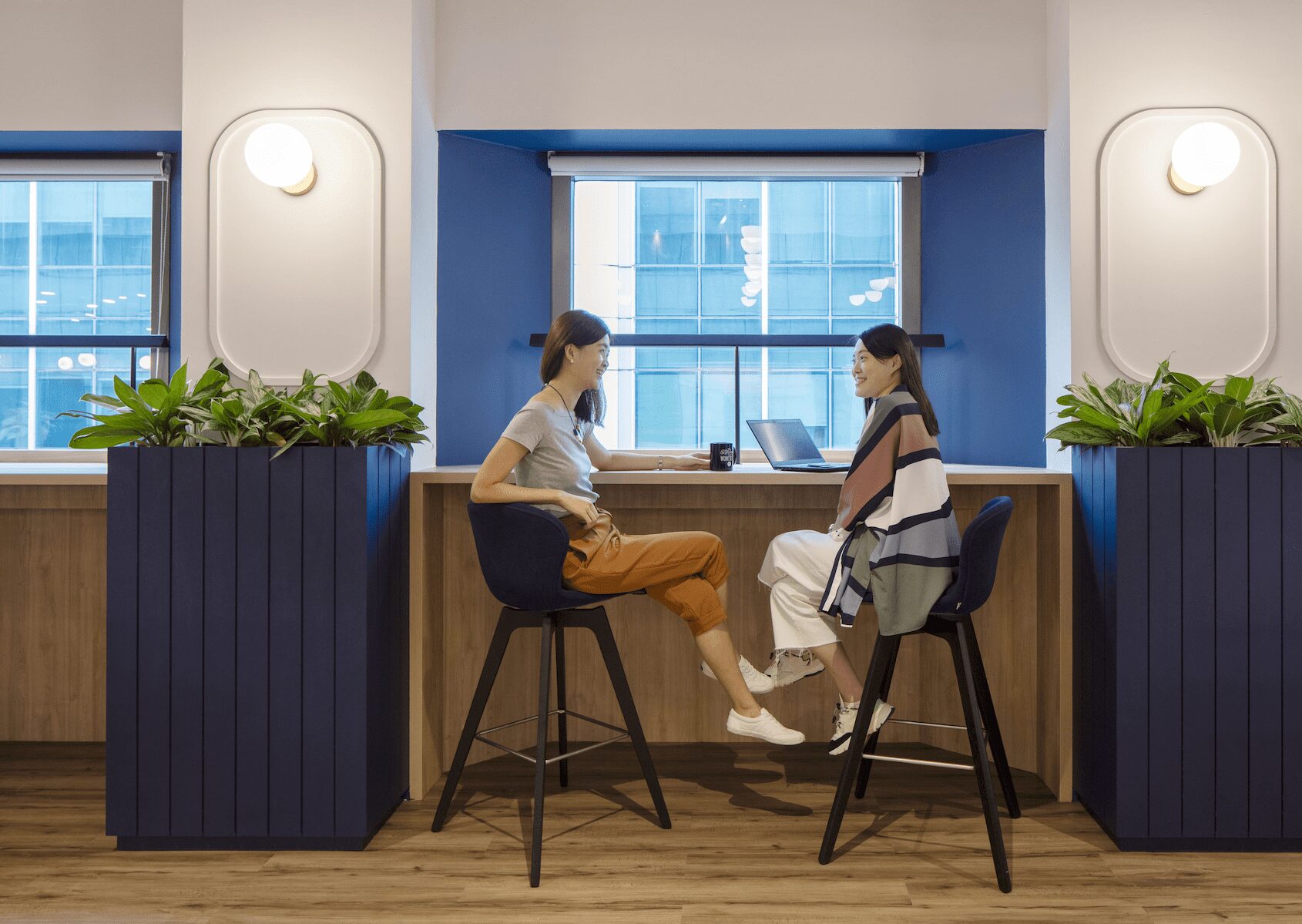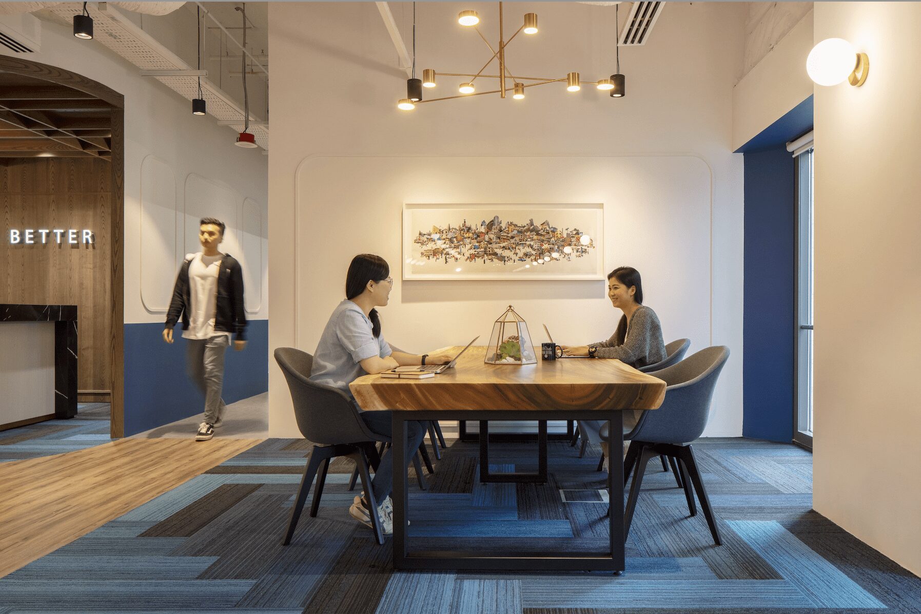 The entrance, adorned in warm colors such as blue and orange, welcomes you to a cozy co-working space like a living room. It is the only JustCo location with a rooftop terrace, and fitness and outdoor events are held regularly here!You’ll find affluent spaces where you can switch between work and off!