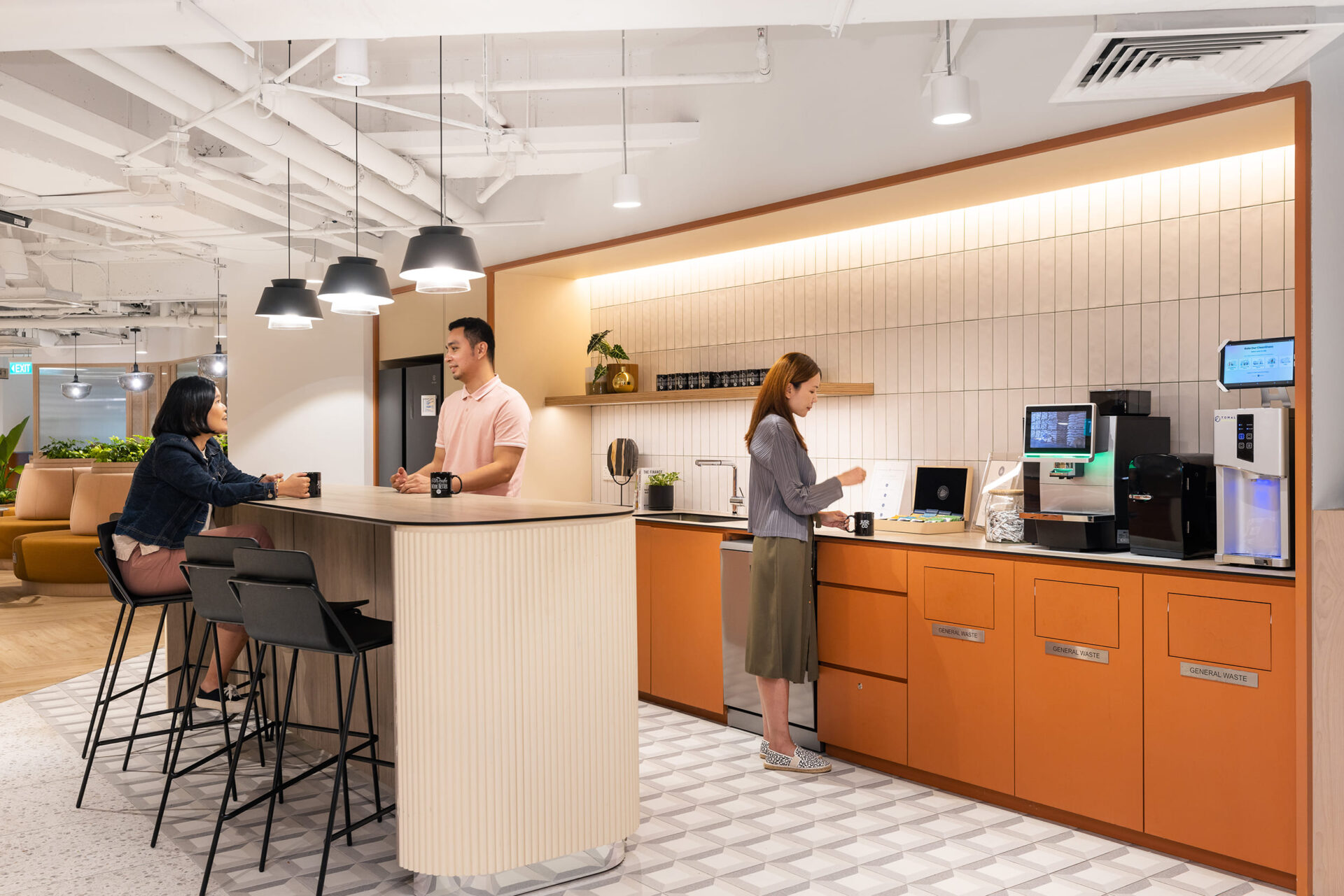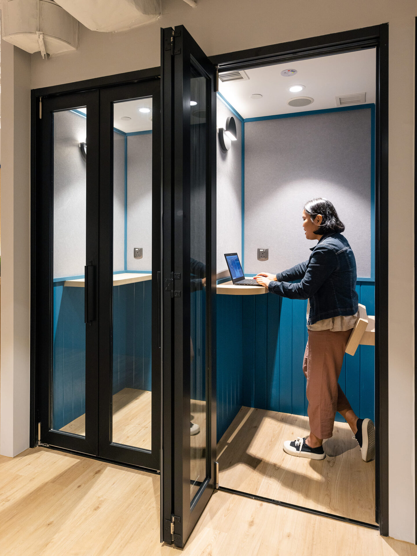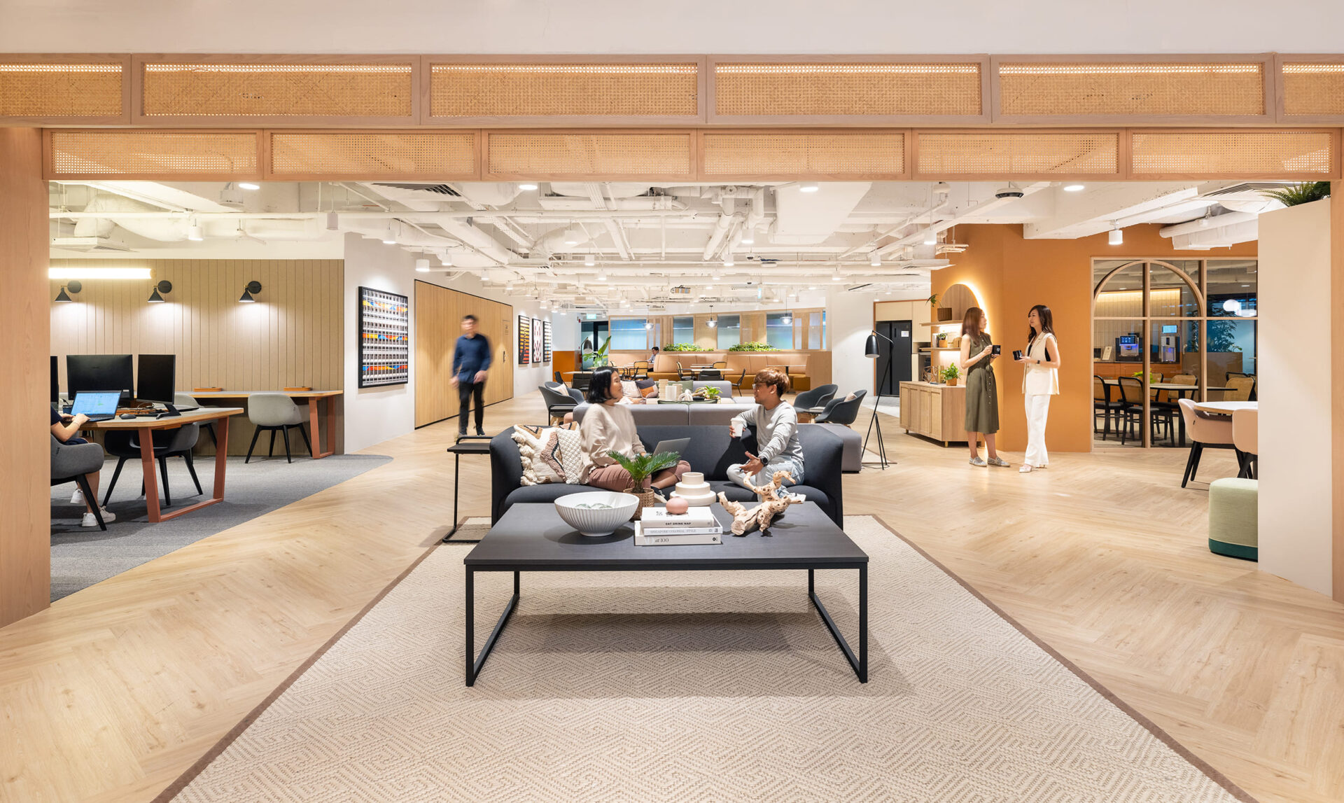 The interior radiates warmth and energy, thanks to its extensive use of wood designs complemented by bright beige and orange tones. Designed to foster engagement and conversation among a diverse community, the space boasts 16 phone booths for vibrant exchanges, ensuring lively interactions both within and outside the office. This serviced office is more than just a workspace; it’s a dynamic environment crafted to inspire creativity, collaboration, and connection among professionals.