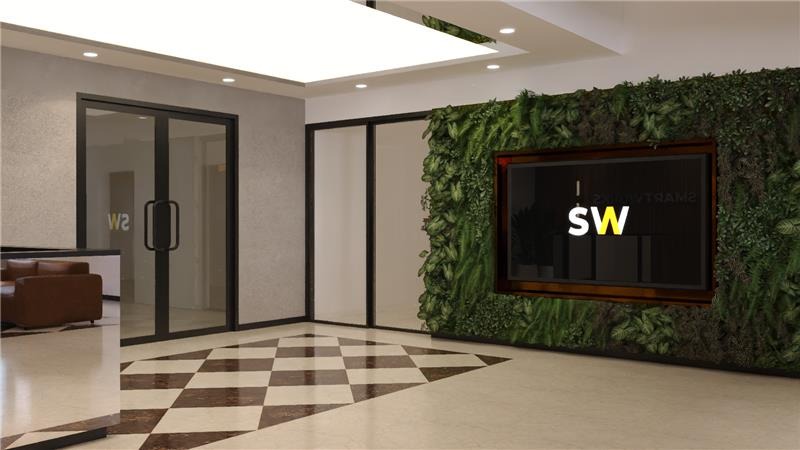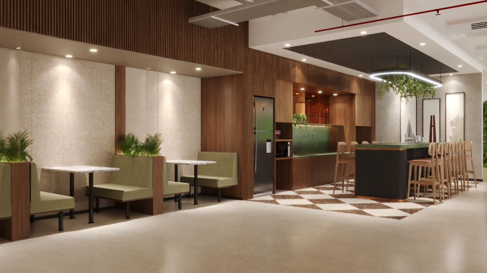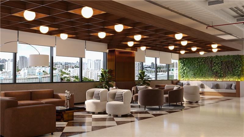 The workspace features a warm and contemporary design, with wood-accented ceilings, greenery elements, and thoughtfully designed lounge and breakout areas. The space feels bright and open, while the mix of open seating and private corners creates a balanced and inviting setting.