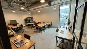 Nestled just a six-minute walk from Bendemeer MRT station Exit B and surrounded by lush greenery, the Vanguard Campus serviced office offers a chic, secluded workspace outside the CBD. The back entrance enhances its private atmosphere, leading into a spacious area adorned with light beige wood and flooded with natural light.
